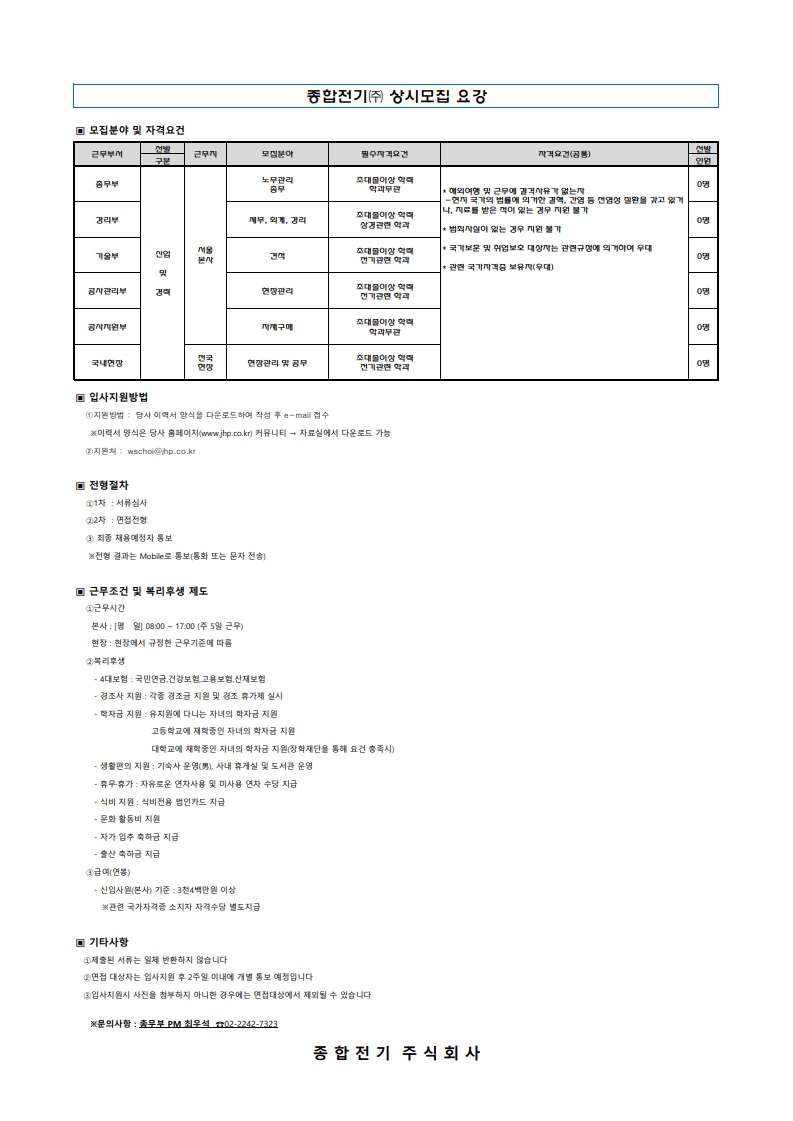 2026년 종합전기(주) 직원 상시채용 - 접수중